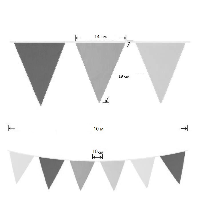 Гирлянда тканевая односторонняя № 16, 10 м - 1 шт. Общая длина гирлянды - 10 м. Расстояние между флажками 10 см. Длина флажка 19 см, ширина флажка 14 см.